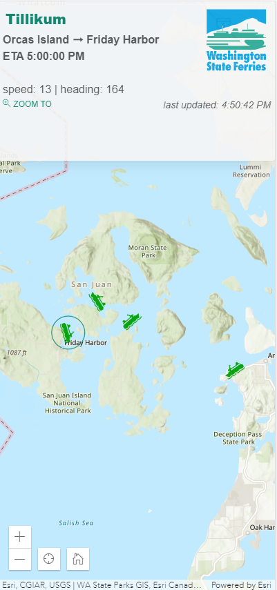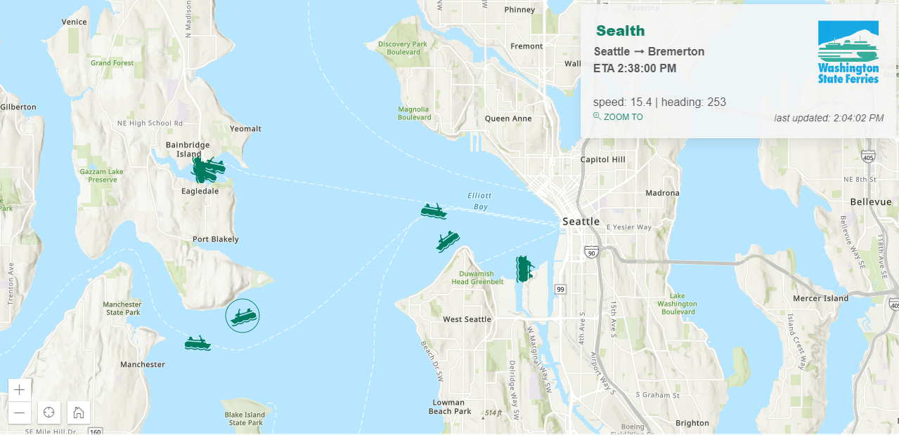 The application is exactly what it says on the package: a web mapping application that shows real-time location and schedule details for individual vessels in the Washington State Ferry System. I consider 8 seconds to be real-time — and if you miss your boat because of an 8-second lag, my friend, you are cutting it way too close.